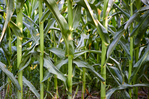 © watcherfox, Obraz premium Close-up of green corn stems near the ground