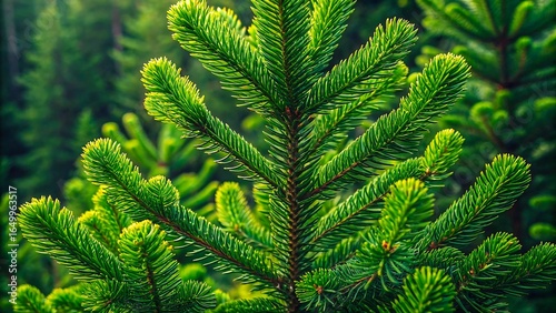Obraz premium Close-up of green fir tree branch in lush forest symbolizing nature,...