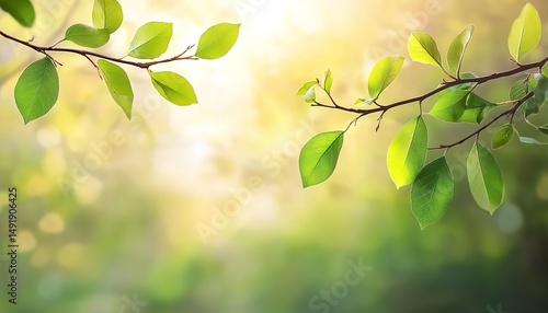 © ma, Obraz premium Close-up of green leaves on branch with soft backlight creating bokeh.