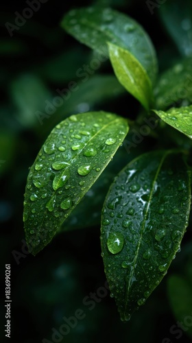 Fototapeta premium Close-up of green leaves with water droplets, showcasing nature's beauty and...