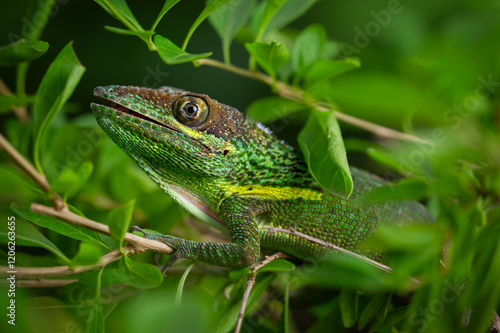 Obraz premium Close-Up of Green Lizard Among Vibrant Leaves