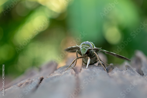 © Patara, Fototapeta premium Close up of green night butterfly on the old wood