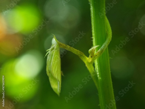 © Hendra Susanto0311, Naklejka premium Close-up of green plant stem with tiny hairs and curled dried leaf against blurred background