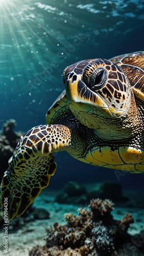 Fototapeta premium close-up of Green Sea Turtle, cinematic, deep sea background