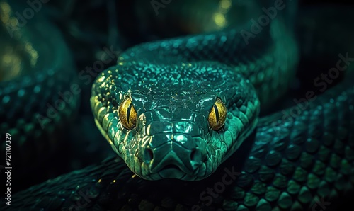 © VGX Ultra, Fototapeta premium Close-up of Green Snake with Intense Yellow Eyes and Glowing Scales