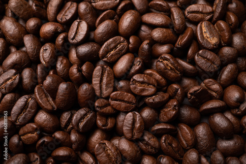 Fototapeta premium Close up of group black coffee beans. Strong black espresso, Grounds of coffee background, texture