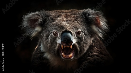 © SlashStd, Fototapeta premium Close-up of growling koala bear on black background.