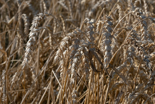 Fototapeta premium Close-up of grown yellow golden wheat with focus on the culms and ears in front. Agriculture, harvest