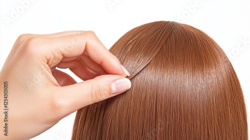 Fototapeta premium Close-Up of Hair Styling with a Hand Adjusting Wig Hair on a White Background,3D rendering