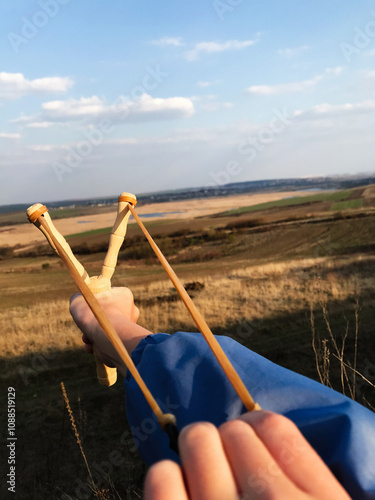 © AS Photo Family, Fototapeta premium Close-up of hand aiming wooden slingshot in sunny landscape