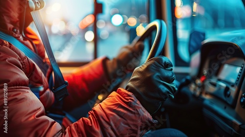 © Naknakhone, Obraz premium Close up of hand bus driver fastening seatbelt. Image of hand.