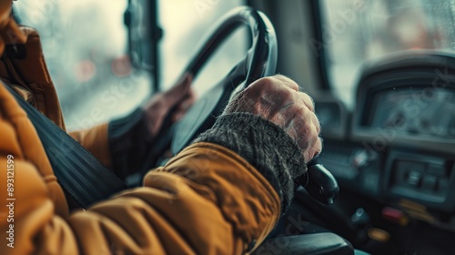 © Naknakhone, Obraz premium Close up of hand bus driver fastening seatbelt. Image of hand.