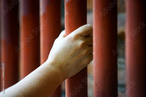 Obraz premium Close-up of Hand Grasping Red Metal Bars in an Industrial Setting