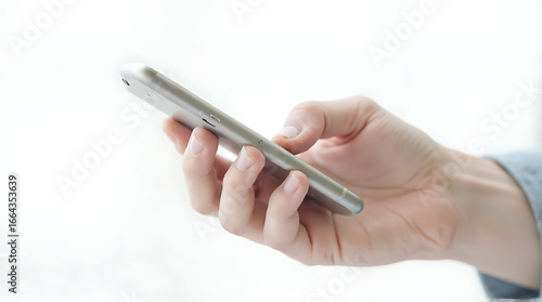 Fototapeta premium Close up of hand holding and using a mobile smart phone in a bright modern...