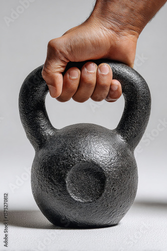 © Lazy_Bear, Fototapeta premium Close-up of hand holding heavy black kettlebell on gray background. Concept of fitness, strength training, gym workout and physical exercise