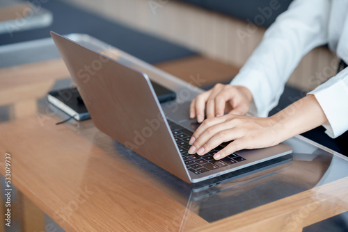 Fototapeta premium Close-up of hand of businesswoman working together using laptop computer to...