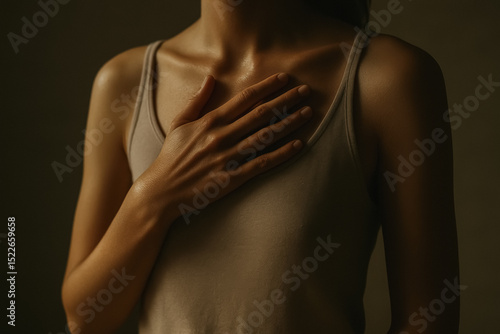 Fototapeta premium Close-up of hand over heart on woman's chest in emotional moment, generative AI