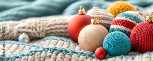Fototapeta premium Close-up of handmade Christmas ornaments crafted from wood, fabric, and sustainable materials, resting on a cozy knit blanket