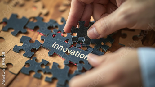 Obraz premium Close-up of hands fitting a puzzle piece labeled "Innovation" into the larger...