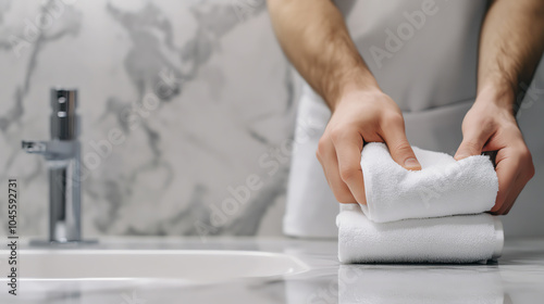 Fototapeta premium Close-up of hands folding white towels neatly on a marble countertop,...