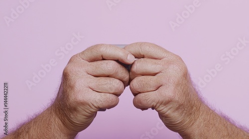 Fototapeta premium Close-up of hands holding a small object. Hands are clenched around a thin, gray item against a soft pink background