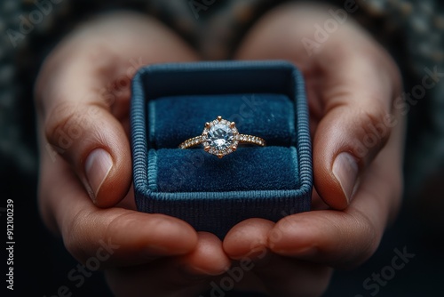 © KADER, Fototapeta premium Close-Up of Hands Holding Open Ring Box with Engagement Diamond Ring, Blurred Background, Valentine’s Day, Minimalistic Composition