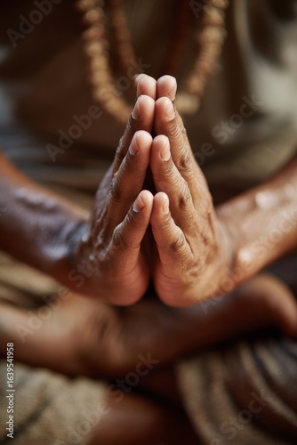 © Artlana, Fototapeta premium Close-up of hands in prayer position, sitting cross-legged, wearing beaded necklace.