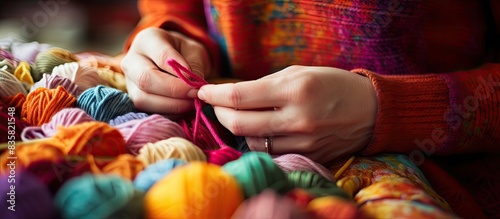 Fototapeta premium Close-up of hands knitting a vibrant scarf, with copy space image.
