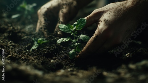 Obraz premium Close-up of hands planting a seedling in rich soil.