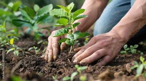 Fototapeta premium Close-up of hands planting a small tree seedling in a garden.