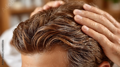© Beatriz, Naklejka premium Close-up of hands running through wavy, wet hair with light reflecting on the surface, creating a textured and reflective appearance.