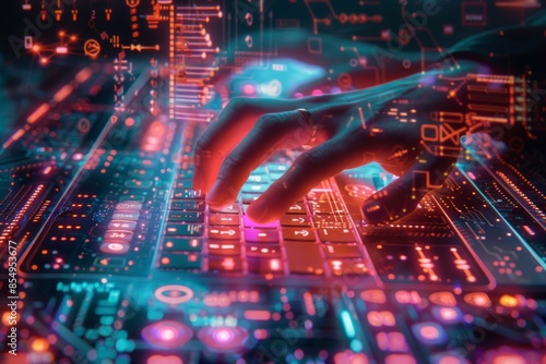 © neirfy, Fototapeta premium Close-up of hands typing on futuristic, glowing holographic keyboard, representing advanced technology and innovation.