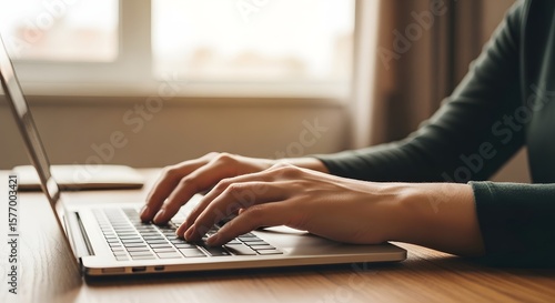 © Han, Fototapeta premium Close-up of Hands Typing on Laptop Keyboard, Modern Workplace Concept