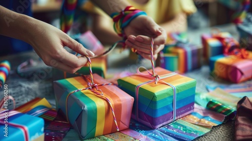 Fototapeta premium Close-up of hands wrapping colorful rainbow-themed gifts, symbolizing celebration, inclusion, and joy in a vibrant setting.