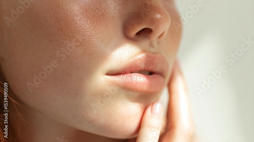 © Zheng, Obraz premium Close-up of healthy glowing human skin texture with smooth surface and natural tone, dermatology and skincare concept for beauty products or medical treatment.