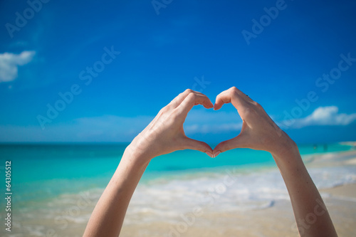 Fototapeta premium Close up of heart made by female hands background the turquoise