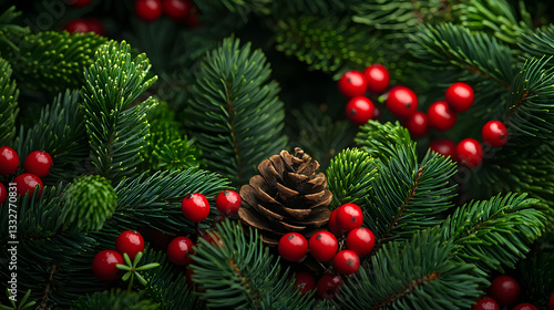 © IA Tuga, Fototapeta premium Close Up of Holly Berries, Pine Cones, and Green Foliage with Realistic Texture and Shading
