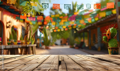 © Ihor Voron, Fototapeta premium Close-up of horizontal homogeneous wooden surface in the foreground, blurred background in summer outdoor cafe