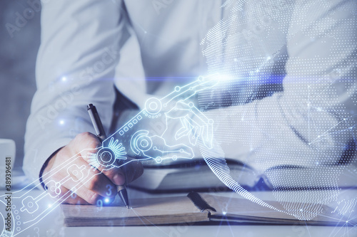 Fototapeta premium Close up of human hands and abstract innovative technologies for industries. Double exposure.