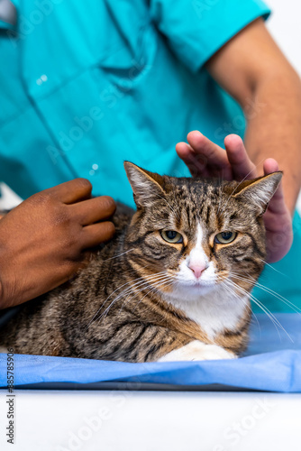 Naklejka premium Close up of human hands stroking a cat