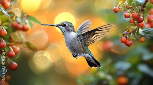 © RAKSIWAH, Naklejka premium Close-up of hummingbird in a colorful garden setting