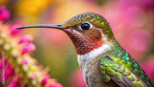 © Olga, Obraz premium Close-up of hummingbird near colorful flowers