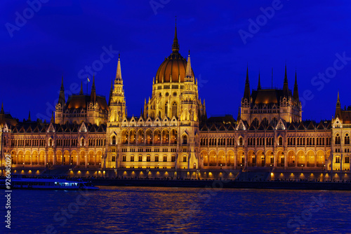 © Katie Chizhevskaya, Fototapeta premium Close-Up of Hungarian Parliament Building at Night with River