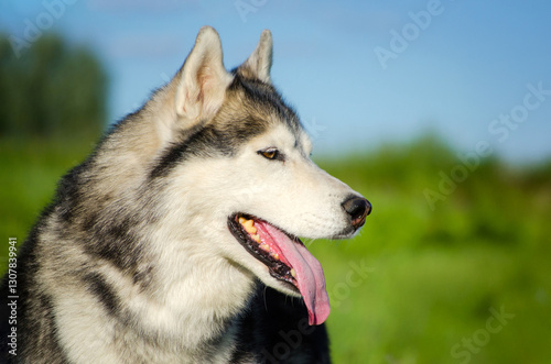 Naklejka premium Close-up of husky with tongue out, basking in sunlight. Lush green field and blue sky create vibrant backdrop, highlighting dogs joyful expression. Profile view captures serenity