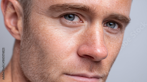 Obraz premium Close up of hydrated male face with fine micro shimmer and bright grey eyes showing natural skin texture and light facial hair