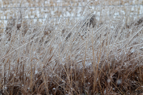 © GWells, Fototapeta premium Close up of ice covered grass in front of fence