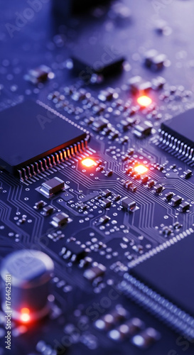 © Mirivox, Obraz premium Close-up of illuminated circuit board, showcasing intricate electronic components and glowing elements, representing technological advancement and innovation