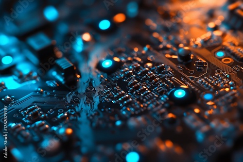 © BerkahStock, Fototapeta premium Close-up of illuminated circuit board with components and wiring.