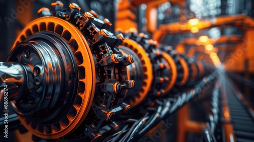 Fototapeta premium Close-up of industrial machinery with gears in a factory setting, highlighting engineering precision and technological advancement.