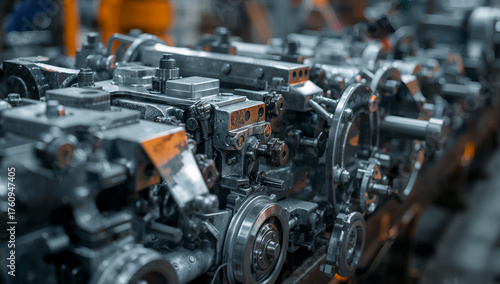 Fototapeta premium Close-up of industrial machinery with gears, wheels, and mechanical components